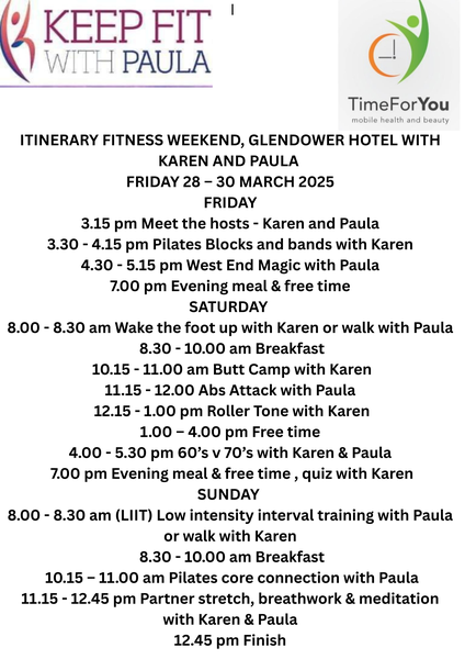 Karen and I are pleased to announce our 2026 Fitness Weekend. We were so impressed with the venue last year we have booked again. We received lots of positive feedback from our clients and the staff were amazing. It was an action packed weekend of fitness classes, walks, free time Saturday afternoon, Friday